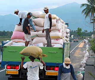 4月初,在菲律宾吕宋岛北部的卡加延山谷,当地农民往车上装载收获的稻米。新华社记者 吴强 摄