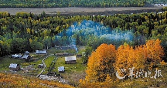 初秋时节,白桦林一片金黄,映衬着银色的雪山,林边图瓦人的木屋更显得安详。无论从任何一个位置放眼所望,都是热烈而明朗的金黄色,层林尽染,绚丽多彩,而小河、木房、炊烟、桦林及禾木桥上放牧的人们则是美景中的漂亮点缀。在禾木村周围的小山坡上可俯视禾木村以及禾木河的全景,远观日出、雪峰与涓涓溪流,近览图瓦人家,是拍摄日出、晨雾、木屋、禾木河的绝佳取景地。