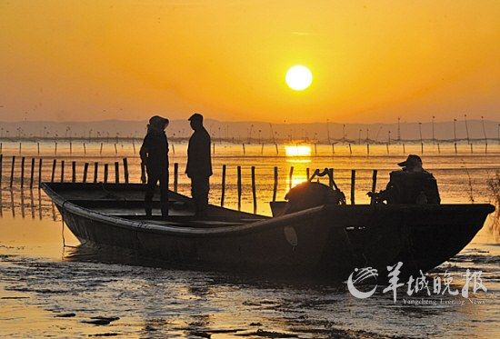 清晨,渔船缓缓驶离码头前往博斯腾湖区捕鱼 姚彤 摄