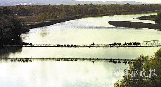 新疆阿勒泰布尔津县窝依莫克乡阿克吐别克村,正在转场的牧民走过“牧民桥”沙达提 摄