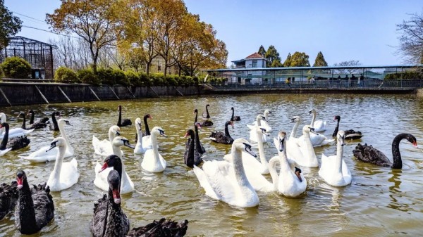 在养殖场中间的人工湖,黑天鹅、疣鼻天鹅们悠然自得,成双成对在湖中游荡,时不时摆个经典的“天鹅爱心”造型,虐一虐别的“单身鸟”。