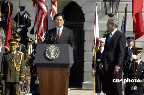 2006年4月22日,美国总统布什举行仪式欢迎中国国家主席胡锦涛,胡锦涛在白宫表示:推进两国关系符合中美两国利益。
