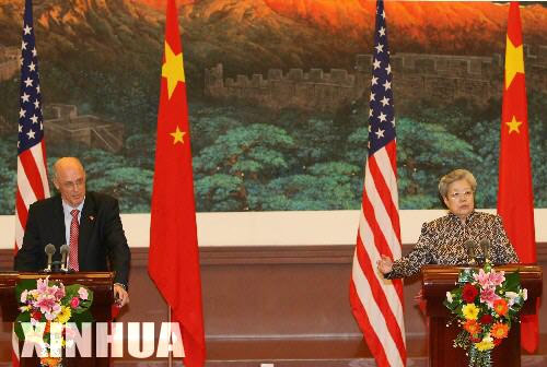 2006年9月20日,国务院副总理吴仪在北京人民大会堂与美国总统特别代表、财政部长保尔森会谈。会谈结束后,吴仪和保尔森一起会见中外记者,共同宣布正式启动中美战略经济对话机制。新华社记者黄敬文摄