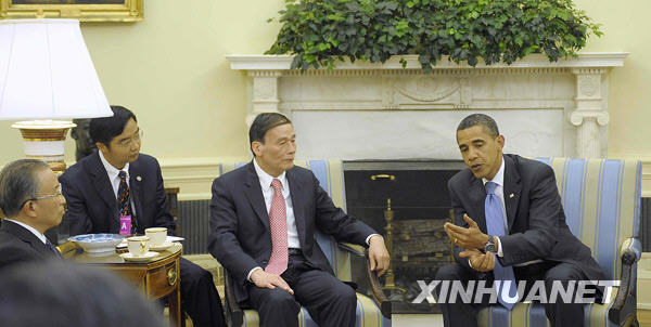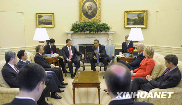 7月28日,美国总统奥巴马在首都华盛顿白宫会见正在华盛顿出席首轮中美战略与经济对话的中国国家主席胡锦涛特别代表、国务院副总理王岐山和国务委员戴秉国 新华社记者张岩摄