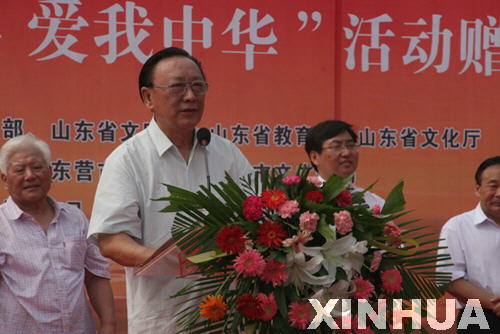 中广网北京7月30日消息 7月22日,山东省“文化志愿服务行动”启动仪式暨“诵读经典、爱我中华”活动赠书仪式在东营市明月社区举行。省文明办专职副主任王红勇,省文化厅副厅长李宗伟出席仪式并讲话,东营市副市长、市文明委副主任王吉能致辞,文化志愿者代表:省话剧院著名表演艺术家薛中锐、省美术馆著名书法家刘锡山、山东卫视节目主持人王乐斌、山东人民广播电台主任播音员侯波等参加了仪式。