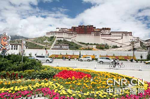 蓝天白云,鲜花簇拥,西藏布达拉宫广场一片花的海洋。新中国成立60周年,也是西藏民主改革50周年。西藏各族人民在中央的关怀和全国人民的大力支援下,雪域高原发生了翻天覆地的变化。从贫穷走向富裕,从封闭走向开放,从落后走向进步……西藏创造了经济社会发展几十年跨越千年的人间奇迹。这是9月19日上午记者在布达拉宫广场拍摄的镜头。
