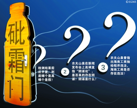 “砒霜门”事件一出,事件的双方:海口市工商局和农夫山泉及统一这两家企业就展开了一场“战争”。农夫山泉从喊冤到愤怒再到指责,态度一步步强硬;而海南省海口市工商局的说法也几经摇摆,前后不一。经过几个回合的“对决”,此事件是否走到了尽头?事态是否明朗了呢? |