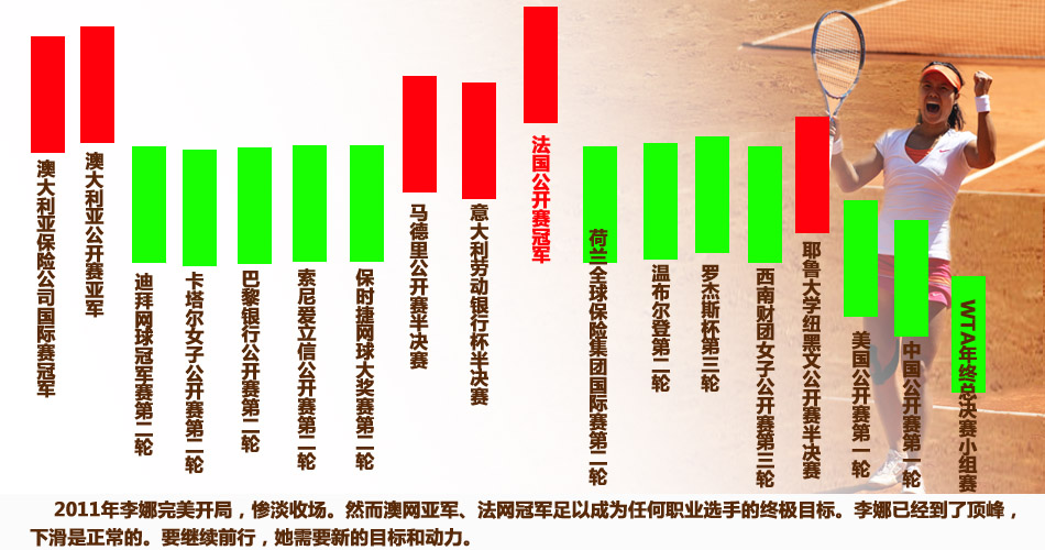 ·李娜——夺冠 6月4日,法网赛场一路突破的中国网球领军人物李娜直落两盘将意大利的卫冕冠军斯基亚沃内斩落马下,成为第一个捧起大满贯赛事单打奖杯的亚洲人。凭借这一胜利,李娜的世界排名也将从第七跃居至第四,平了日本名将伊达公子创造的亚洲最高排名。 这个冠军也让她的生活发生了翻天覆地的变化。丰厚的奖金源源而来,众多著名赞助商接踵而至,李娜俨然在一夜之间成为了世界体坛新的“吸金女王”。但一系列的商业秀和庆功活动也让李娜承受了巨大的压力。重返赛场后,李娜美网首轮即遭爆冷,随后在中网首轮吞蛋出局。在伊斯坦布尔年终总决赛上,李娜更是遭遇了最惨痛的失利。“其实不管今年的状态跟过山车一样还是怎么样,但无论多少年以后,当自己回想2011年的时候,我觉得会是很值得回味的一年。因为毕竟有好就有坏…”赛后,李娜在接受采访时,几乎已经忍不住哽咽。