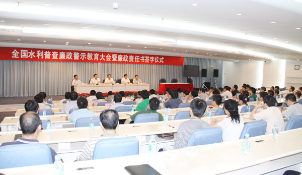 9月7日上午,全国水利普查廉政警示教育大会暨廉政责任书签字仪式在京举行。水利部党组成员、中纪委驻部纪检组组长董力出席会议并讲话。水利部副部长、国务院水利普查办公室主任矫勇代表国务院水利普查办与承担水利普查预算单位负责人签订廉政责任书。中纪委四室副主任王陈剑作廉政警示教育专题讲座。