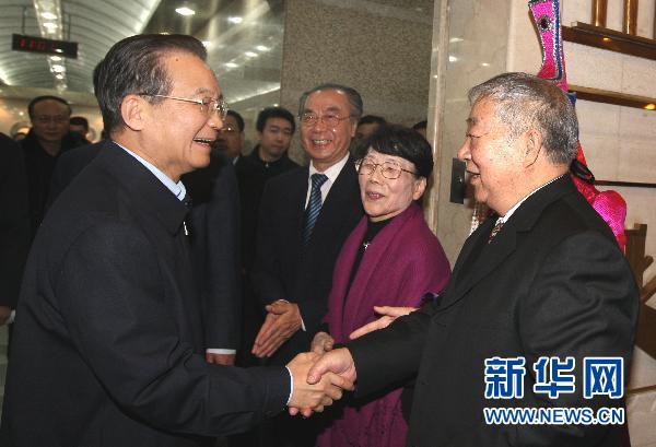12月26日,中共中央政治局常委、国务院总理温家宝来到中央人民广播电台,看望广大编辑记者和干部职工,向大家致以亲切的问候。温家宝还走进中央人民广播电台“中国之声”直播间,通过无线电波和收音机前的全国听众进行交流。这是温家宝与著名播音员铁城(右一)、葛兰(右二)和方明(右三)亲切交谈。新华社记者姚大伟摄
