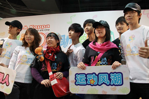 除了开开心心做游戏,至上励合在现场也进行了爱心义卖。这五个爱美的小伙子还分成了两队,与“至天使”一起为Kappa设计制作的爱心主题服做搭配,每个人都使出了浑身解数。Kappa的帽子、围巾、还有本次活动的爱心娃娃,但凡店里看得见的、能借的、能拿的全都往身上搭,穿在“至天使”身上的爱心主题服时尚感十足。两位歌迷穿着和偶像共同搭配出的时尚版爱心主题服走秀,虽然表现都很害羞,但能与偶像手拉手走秀,幸福掩饰不住地洋溢在脸上。Kappa的爱心代表也无法从两队中选出冠军,只好都赠送礼品。两位幸运的“至天使”不仅与偶像近距离接触,还能得到精美礼物,真是羡煞旁人。