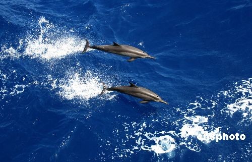 4月12日上午,中国海军首批护航编队“海口”号导弹驱逐舰正伴随护航商船穿越亚丁湾,一群海豚从军舰左舷下翻腾跳跃、追波逐涛而行,其中两只在海面上比“翼”双飞,宛若一对海豚情侣。孙自法 摄