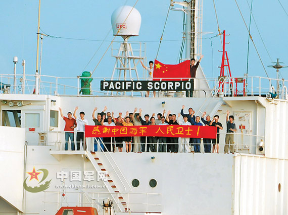 4月12日,在亚丁湾海域,中国海军首批护航编队护送的“明达”号商船打出表示感谢的横幅。解放军报记者钱晓虎摄