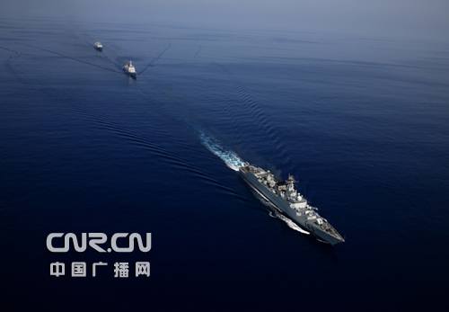 2009年4月8日,中国海军护航编队在亚丁湾编队航行。(陈亿摄影)