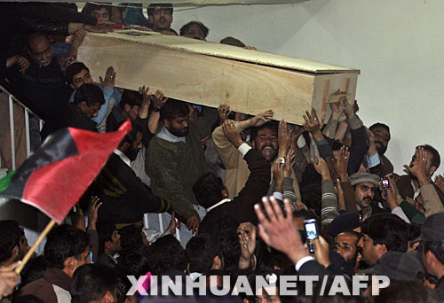 12月27日,在巴基斯坦的拉瓦尔品第,当日遇刺身亡的巴前总理、人民党主席贝·布托的支持者运送她的灵柩离开医院。当天早些时候,贝·布托在拉瓦尔品第举行的竞选集会上遭袭击身亡。目前贝·布托的遗体已被移出医院,准备运往她的家乡下葬。 新华社/法新