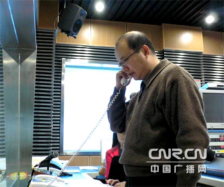 12月4日,中央人民广播电台中国之声联合司法部以及12家省市电台推出法制宣传日特别节目《2007,我们与法同行》。图为主持人张昊(男)、冯雅在直播间。 中广网记者朱卫东 摄