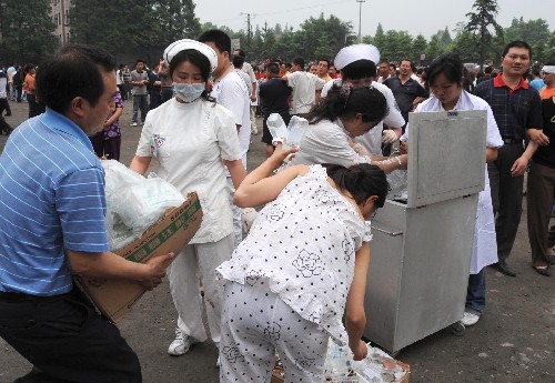 北京时间5月12日14时28分,四川汶川县发生7.8级地震。邻近的四川都江堰市聚源中学发生教学楼垮塌。记者从学校获悉,学校共有师生1800人左右,震垮的这座教学楼有初二、初三两个年级18个班,目前伤亡人数不详,抢救正在紧张进行。 新华社记者陈燮摄