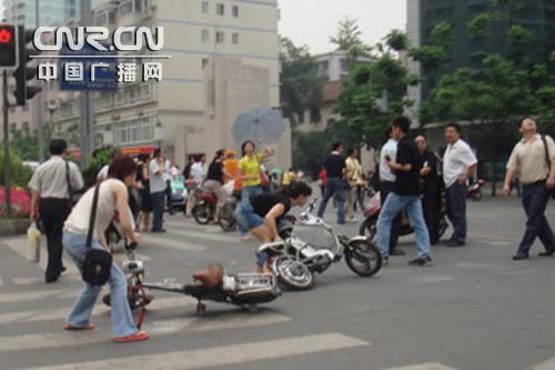 成都正在骑电动车的市民被晃倒在地