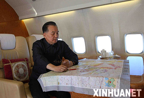 这是温家宝在赶往灾区的专机上。 新华社记者姚大伟摄
