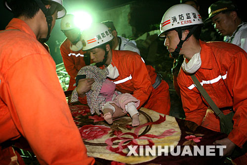 5月14日晚,消防抢险队员在四川绵竹市汉旺镇将1岁女孩沈天奇从废墟中成功救出。 新华社记者 李明放 摄