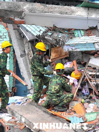 5月13日,救援人员在救护压在废墟下的东汽中学学生。 当日,四川省绵竹市军民不顾塌楼残墙再次倒塌的危险,冒雨抢救被压在废墟下的四川省东汽中学学生。地震后,该校有数百名学生被压在塌楼的废墟下。救援人员已发现几名被压学生,正在冒雨抢救。 新华社记者 何俊昌 摄