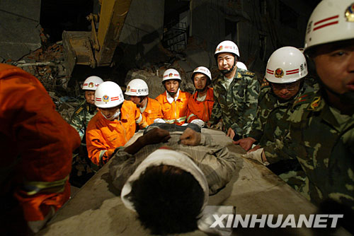 5月16日22时40分,经过长达13个小时的营救,河南消防官兵在四川什邡市成功救出一名被埋长达104小时的幸存者。这名幸存者生命体征稳定,基本没有外伤。这是获救者被抬出。 新华社发(康建国摄)