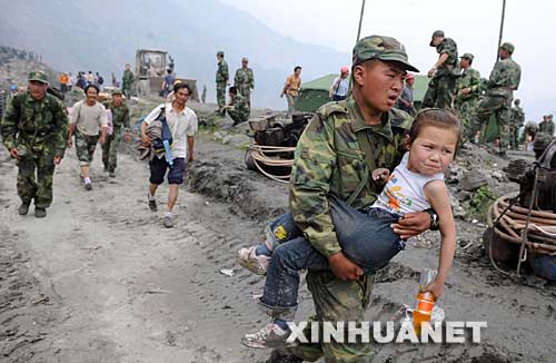 解放军战士抱着小女孩转移出映秀镇