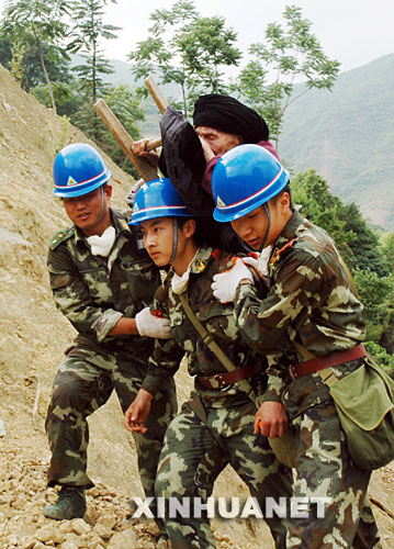 当日,在四川省平武县平通镇开展抗震救灾的武警四川省广安市支队的20名官兵徒步来到海拔1000米以上的大松村,将双目失明的百岁老人李孝珍成功营救下山。 新华社发