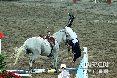 8月21日,男子现代五项马术比赛,中国选手曹忠荣被摔下马。(中广网记者邱翔 曹囡囡摄)
