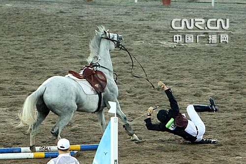 8月21日,男子现代五项马术比赛,中国选手曹忠荣跨越障碍时摔下马。(中广网记者邱翔 曹囡囡摄)