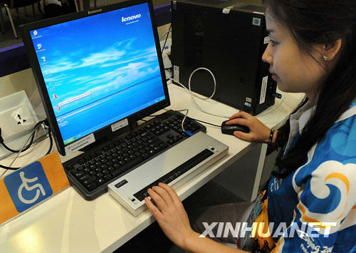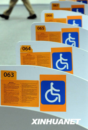 北京残奥会主新闻中心媒体工作间除了各种无障碍标志外,还增添了包括残疾人记者工作台、盲人电脑、残疾人专用储物柜等根据残疾媒体工作者的特殊需求而准备的各种设施和服务项目。据了解,已有来自13个国家和地区的47名乘坐轮椅的残疾记者以及部分视力残疾记者报名采访北京残奥会。 新华社记者王颂摄