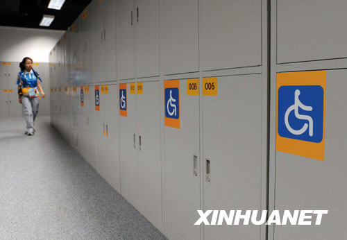 9月3日拍摄的文字记者工作间内的轮椅记者专用储物柜。新华社记者王颂摄