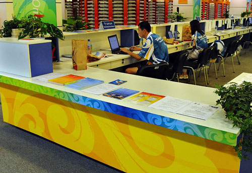 9月3日,为照顾残疾人记者,媒体工作间的服务台降低了工作台面的高度。新华社记者王颂摄 |