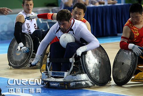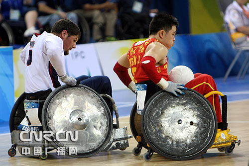 中国队陈君迅速带球突破。9月12日,残奥会轮椅橄榄球首场比赛,中国队30-65不敌美国队。中广网记者邱翔摄