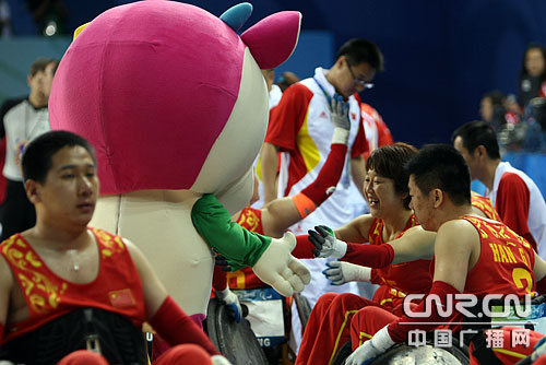 中国队唯一一位女队员张文莉开心地与福牛乐乐击掌鼓励。9月12日,残奥会轮椅橄榄球首场比赛,中国队30-65不敌美国队。中广网记者邱翔摄