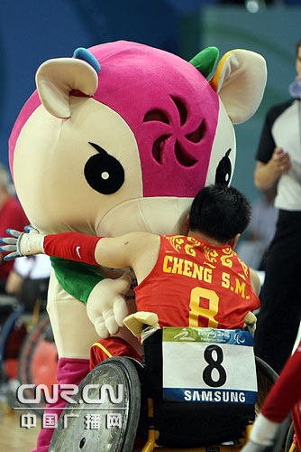 中国队队长程双苗与福牛乐乐热情拥抱。9月12日,残奥会轮椅橄榄球首场比赛,中国队30-65不敌美国队。中广网记者邱翔摄
