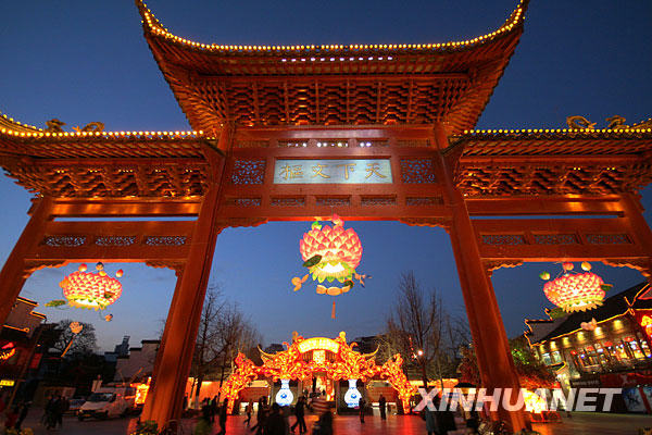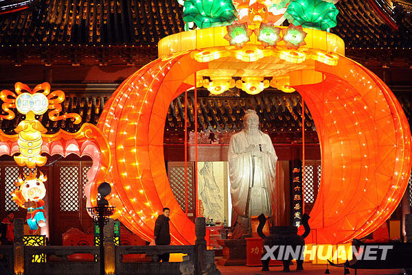 1月23日,游人在夫子庙内观灯。当晚,2009年南京夫子庙灯会亮灯,夫子庙及秦淮风光带一线彩灯齐放,景色迷人。新华社记者孙参摄