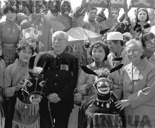 1988年9月23日上午,中央代表团在银川和各族人民共同庆祝宁夏回族自治区成立30周年。这是团长、国家副主席王震和副团长、全国人大副委员长雷洁琼同群众一道观看社火。