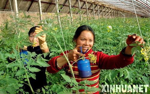 银川市兴庆区掌政镇宏伟蔬菜产业化联合社的两位社员在大棚内进行人工授粉 新华社发(资料照片)