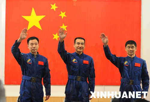 中国“神舟七号”航天员乘组24日下午在酒泉卫星中心与媒体见面并回答媒体提问。翟志刚、刘伯明、景海鹏组成飞行乘组执行“神七”载人航天飞行任务,实施中国航天员首次空间出舱活动。