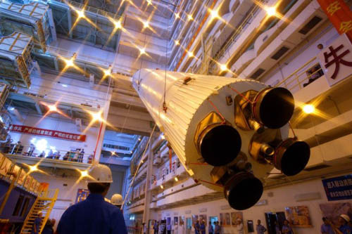 长征2号F在垂直总装测试厂房进行组装