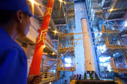 2008年8月10日,在载人航天发射场垂直总装测试厂房,长征2号F运载火箭进行组装。