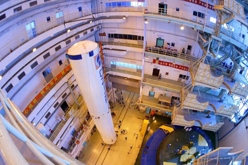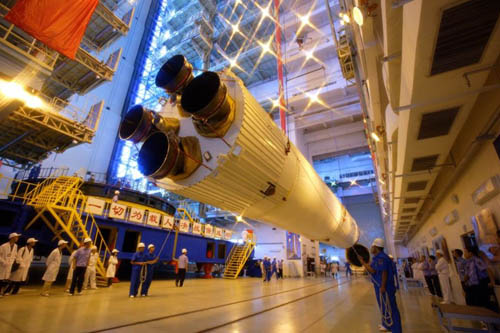 2008年8月10日,在载人航天发射场垂直总装测试厂房,长征2号F运载火箭进行组装。