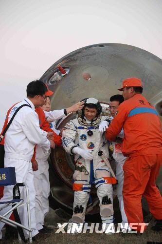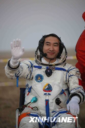 9月28日,神七航天员翟志刚出舱后向人们挥手致意。 新华社记者王建民摄
