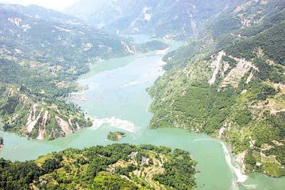 直升机上俯视唐家山堰塞湖