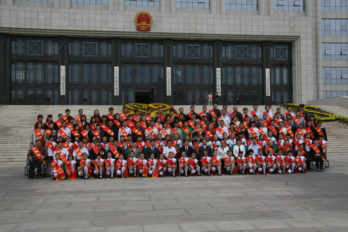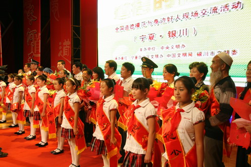 9月19日,全国第八个公民道德日到来的日子里,中央文明办在宁夏回族自治区首府银川举办《道德传承—全国道德模范与身边好人现场交流活动》。图为自治区领导和专程来宁夏参加此项活动的中央文明办部门负责同志和“中国好人”合影