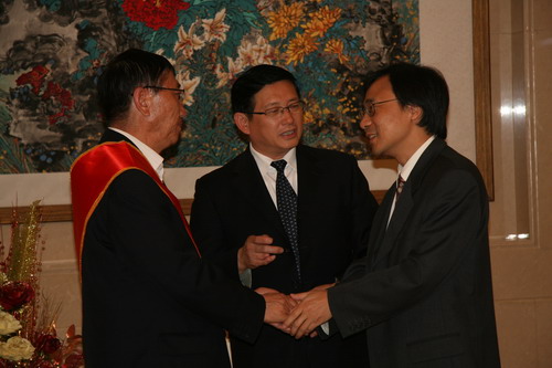 宁夏回族自治区党委常委、宣传部部长杨春光(中),中央文明办秘书组副组长杨武军(右)亲切会见爱岗敬业模范,80后民警楷模海小平的父亲海晶(左)