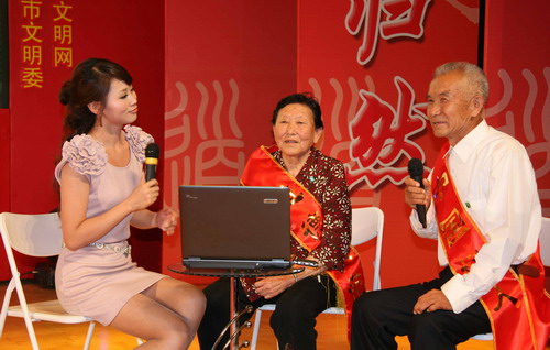 宁夏电视台主持人现场采访助人为乐道德模范、“春蕾奶奶”姜丽娟(中)