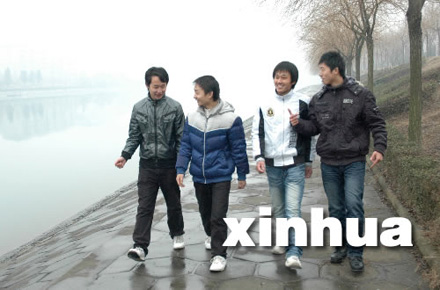 咸宁冰水中救人的咸宁职业技术学院大学生王洪(左一)、刘康(左二)、王力(左三)和咸宁学院大学生吴超一起走在救人事发地淦河岸边(1月15日摄)。新华社记者 李鹏翔 摄