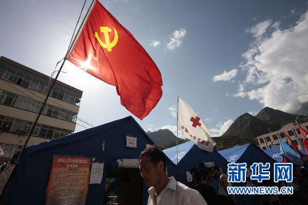8月19日,在舟曲县一个灾民安置点,一面党旗迎风飘扬。行走在甘肃舟曲灾区,总有一抹醒目的红映入眼帘:民房上、帐篷旁,在灾民安置点、各救灾单位,处处可见鲜艳的国旗和党旗迎风飘扬,鼓舞人心,给人力量。